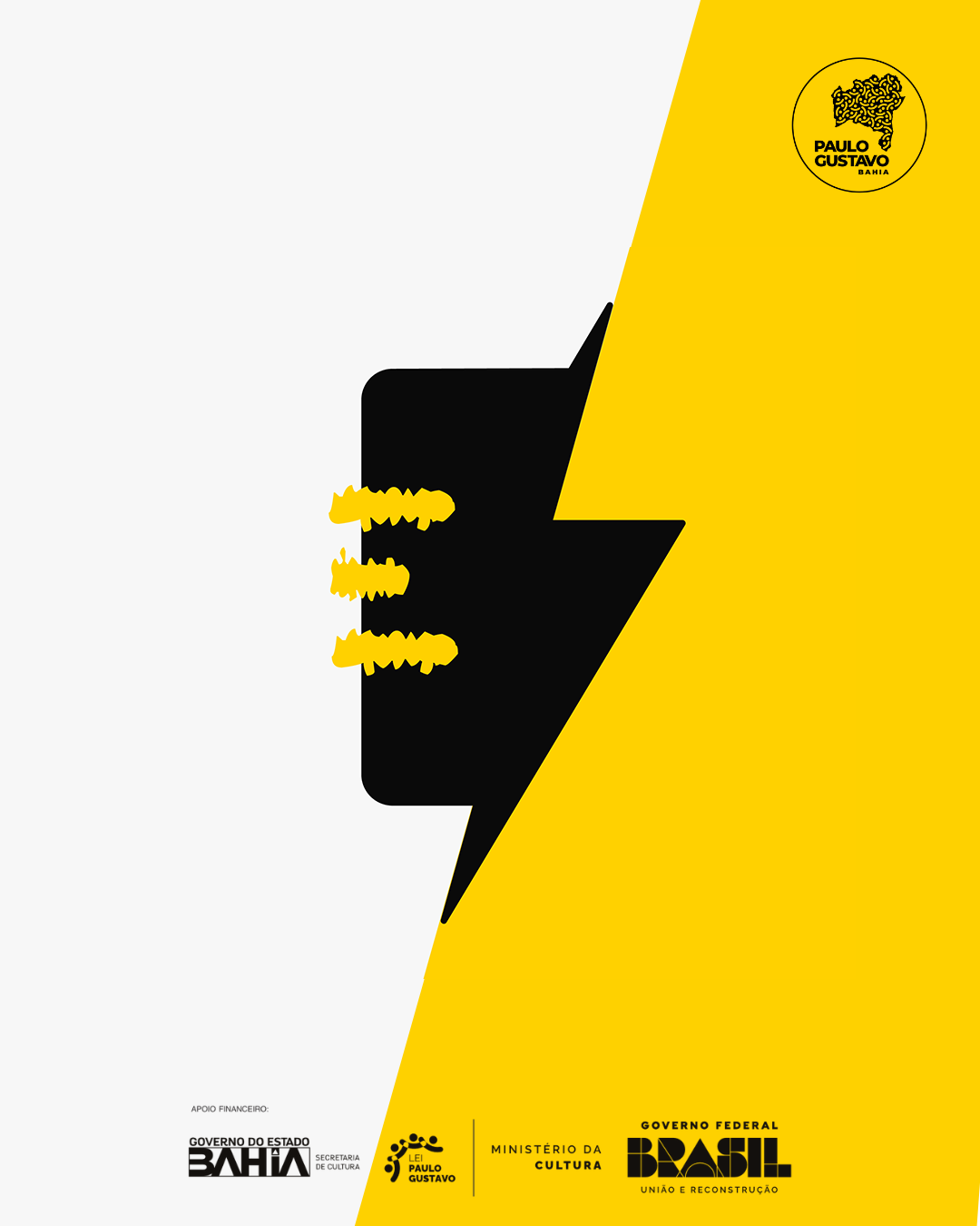 O projeto “Eletrocinese Produções – Suporte ao Desenvolvimento” foi contemplado nos Editais da Paulo Gustavo Bahia e tem apoio financeiro do Governo do Estado da Bahia através da Secretaria de Cultura via Lei Paulo Gustavo, direcionada pelo Ministério da Cultura, Governo Federal. Paulo Gustavo Bahia (PGBA) foi criada para a efetivação das ações emergenciais de apoio ao setor cultural, visando cumprir a Lei Complementar nº 195, de 8 de julho de 2022.